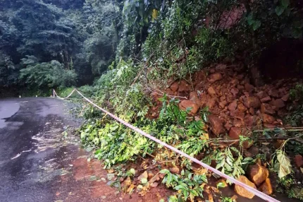 Gần 17h, đèo Bảo Lộc đoạn qua xã Đạ Huoai 2 xảy ra sạt lở. Đất đá, cây bụi ở taluy dương đoạn kéo dài hơn 6 m đổ tràn xuống đường, lấp mương thoát nước hướng từ Đà Lạt về TP HCM. Sự cố không gây thương vong.