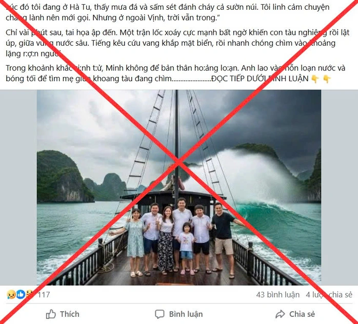 Tương tự, lợi dụng sự quan tâm của dư luận xung quanh vụ lật tàu du lịch Vịnh Xanh 58 trên vịnh Hạ Long, tỉnh Quảng Ninh ngày 19-7 khiến hàng chục người thiệt mạng, nhiều tài khoản mạng xã hội đã đăng tải những hình ảnh, câu chuyện xúc động về các nạn nhân. Tuy nhiên, không ít nội dung trong đó là giả mạo, được tạo ra bằng AI nhằm “đánh” vào cảm xúc, thu hút tương tác của người dùng mạng xã hội. Đáng nói, những hình ảnh giả mạo tràn lan với nội dung phóng đại thương cảm có thể gây thêm tổn thương tinh thần cho gia đình người bị nạn.