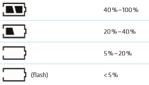 Để theo dõi tình trạng dung lượng pin, bạn có thể nhìn trên màn hình LCD của thiết bị (hoặc có thể tìm thấy trong khi điền thông số cài đặt). Biểu thị pin trên màn hình LCD (góc trái trên cùng) cho biết:
